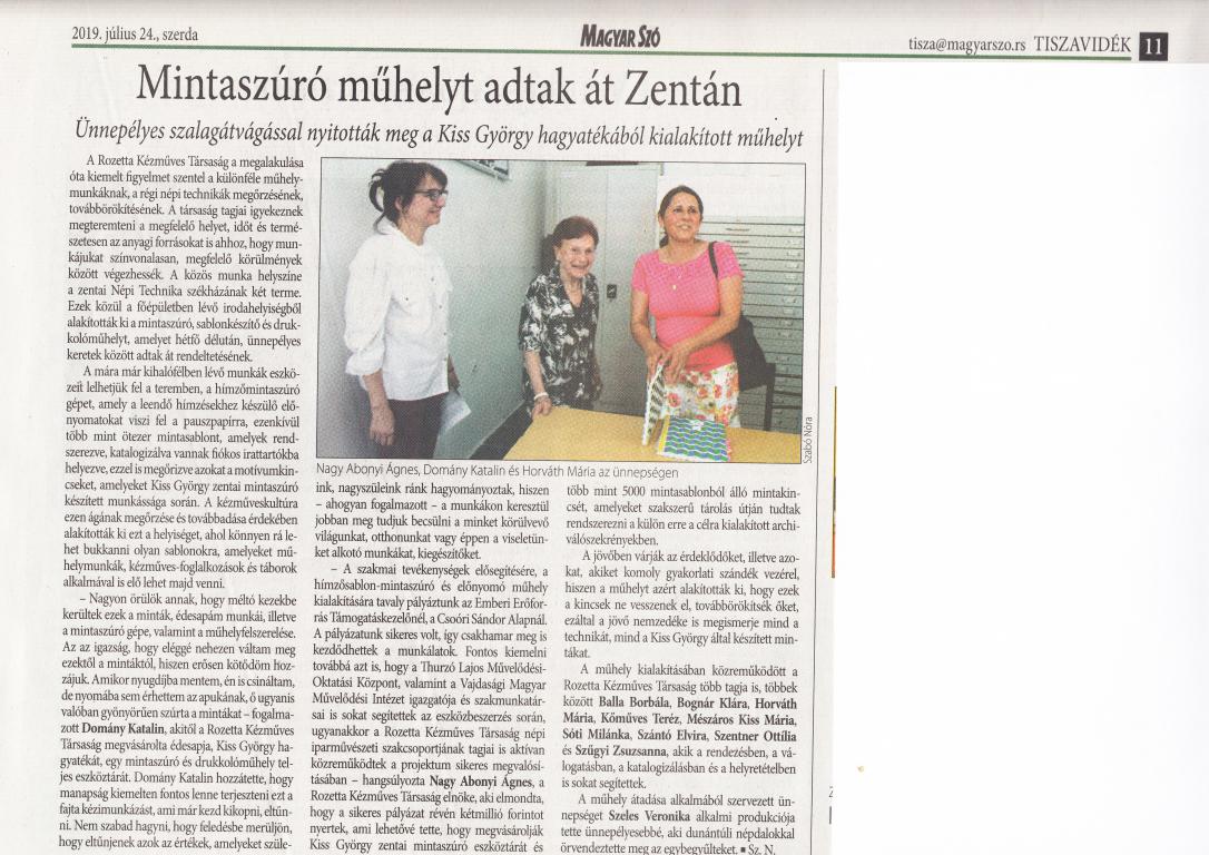 kép és szöveg a médiában: Magyar Szó napilapban 2019. július 22-én képgaléria, 24-én a július 22-i megnyitó – Mintaszúró-műhely átadása Zentán – cikk.